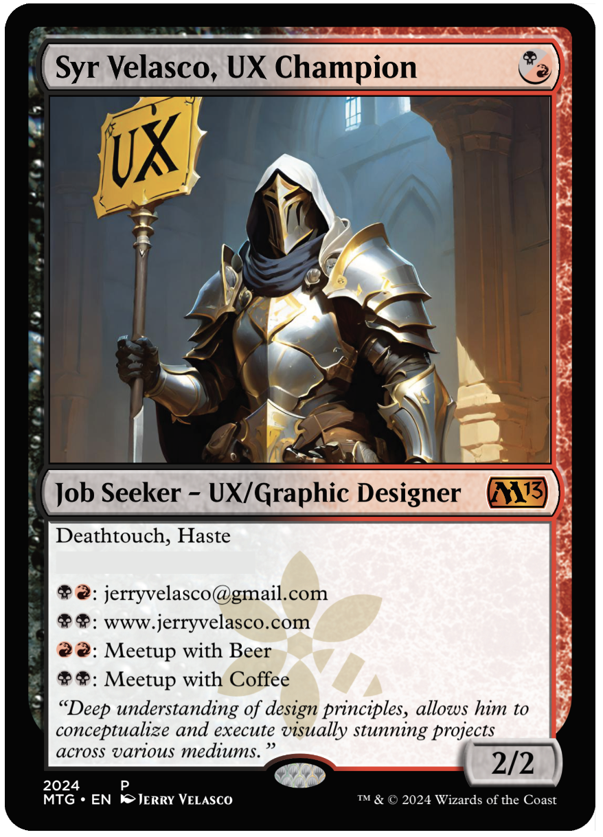 OVERALL: This card was one of the cards printed on metal and contained a QR code. The name Eisheth Zenunium came from an internet search of top popular demon names. This card is from a parallel set of directional series called ‘Jerry Directionals’. This set was similar to UX directionals but the signage was my name instead of UX.
