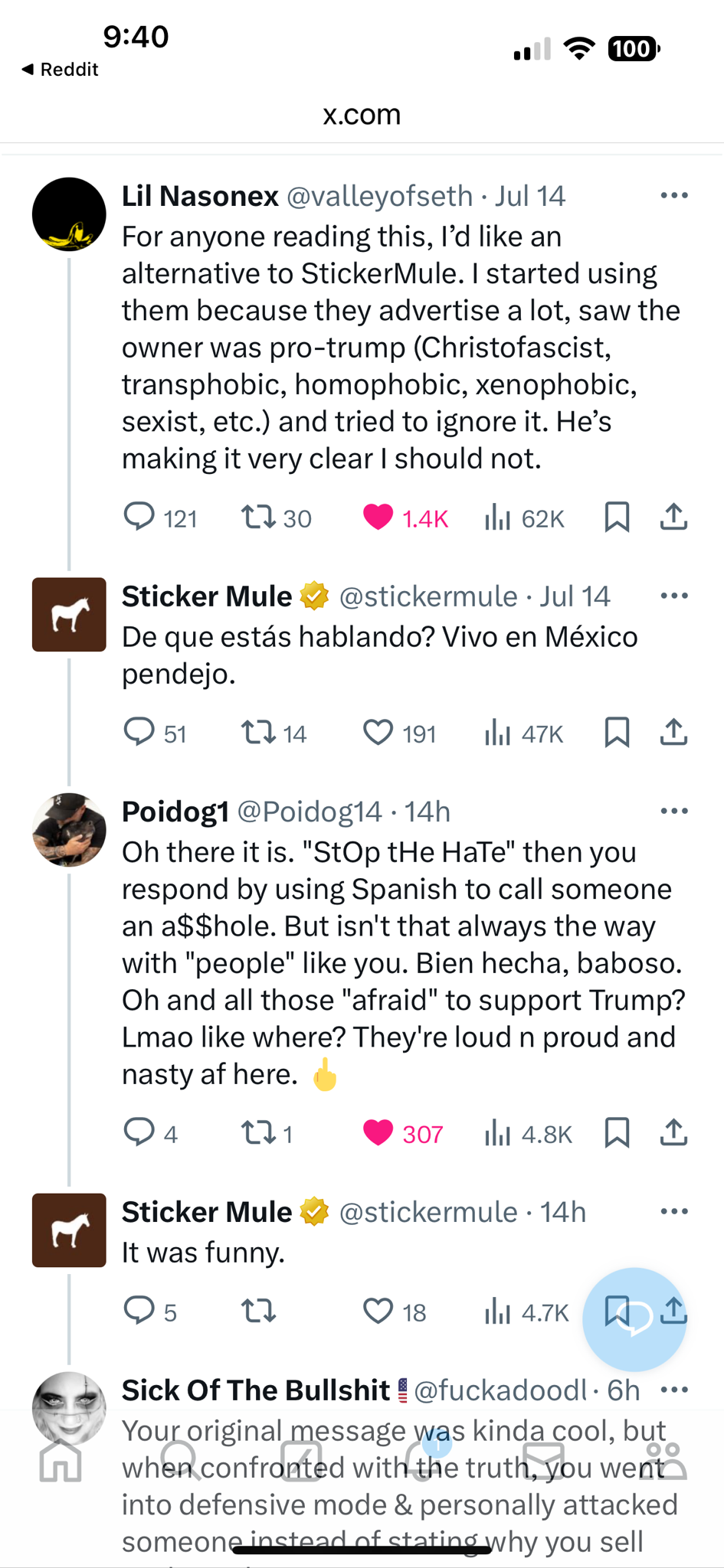 Based on an email (See below) sent today, it’s time to part ways with a printing vendor, Sticker Mule. I assume everyone in their privacy supports whomever they want to, but to use their email platform about hate is wrong – I didn’t sign up for political opinions, it was for product information. I thought companies knew that CUSTOMERS have relationships based on the promises of interaction of BUSINESS, not politics. I even thought it was graphically odd for the company with a mule to be supporting trump. I made Sticker Mule two new logos and a new name that might benefit their new and transparent political alignment. Just when you think it might be an above-board discussion and respectful allegiance, there was a crazy tweet (see below) When does stop the hate meaning calling someone an a$$hole? Really Anthony? Check yourself! You’re too deep in your own hate.